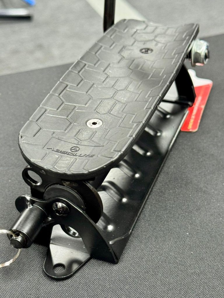 O Suporte de Parede Articulado Absolute acompanha buchas e parafusos para instalação e, graças a um gancho mais largo, é capaz de acomodar pneus entre dez e vinte e nove polegadas, com largura variando entre 1.0 e 2.4’’, com resistência suficiente para segurar até mesmo uma bicicleta elétrica.