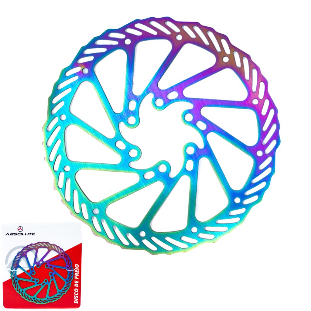 Disponível nos diâmetros de 160, 180 e 203mm e feitos em aço inox de alta qualidade, os discos de freio (ou rotores) da Absolute acabam de ganhar uma nova opção de acabamento: o Oil Slick, também conhecido como camaleão. Este padrão segue uma das tendências mais atuais do mercado, e também está presente em muitos outros componentes da marca, como pedais, avanços, selins e guidões.