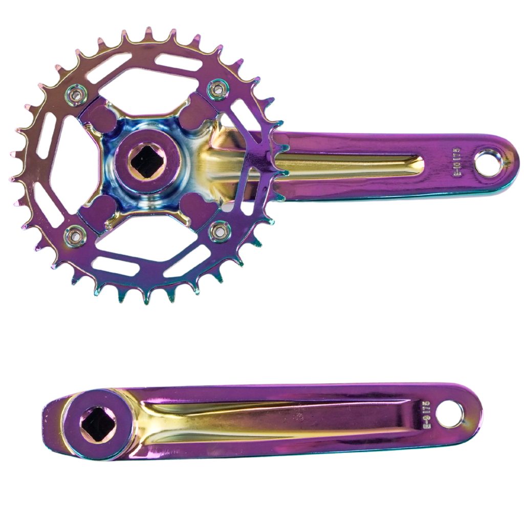 O modelo está disponível em duas versões: 1x com coroa narrow wide de 34 dentes, compatível desde sistemas single speed até 12 velocidades, e 2x com coroas 38/24 dentes, compatível com grupos de 9 e 10 velocidades, além de braços em alumínio com 175mm de comprimento e opções de acabamento preto ou oil slick.